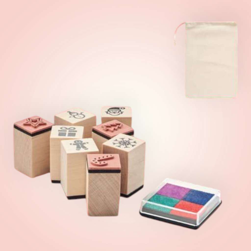 8 darabos karácsonyi bélyegzőkészlet fából, bélyegzőpárnával, 4 különböző színű festékkel, pamut húzózsinóros táskában.