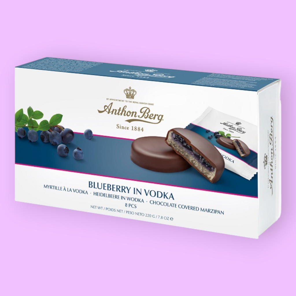 Anthon Berg Blueberry In Vodka 220 g. Marcipános étcsokoládé (41%) áfonyás vodkával töltve (25%).